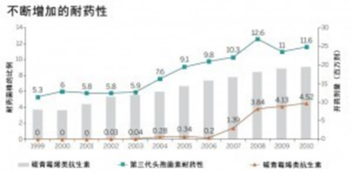 碳青霉烯類抗生素耐藥性。美國(guó)在1999年至2010年間,可耐受第三代頭孢菌素和碳青霉烯類抗生素的肺炎克雷伯氏菌所占的比例不斷增加。該圖也顯示了美國(guó)在1999年至2010年間碳青霉烯類藥物(亞胺培南(imipenen)、美羅培南(meropenem)、厄他培南(ertapenem)和多尼培南(doripenem))的累積開藥量。在這一段時(shí)期中,第三代頭孢菌素的開藥量則相對(duì)穩(wěn)定,每年大約為3000到3500萬劑。